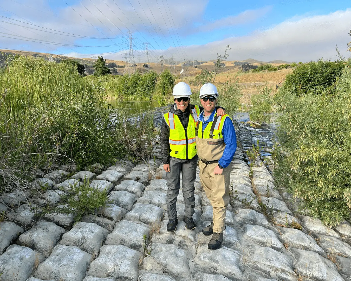 Claire Buchanan, CalTrout project lead, and Patrick Samuel, CalTrout Bay Area Regional Director, stand in front of the barrier on day one of construction